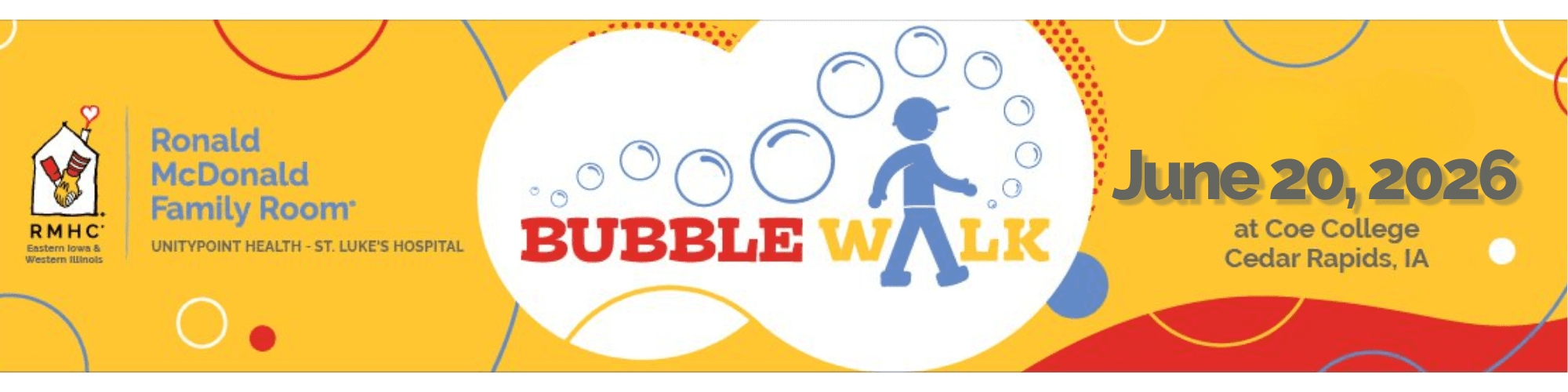 Ronald McDonald House Charities of Eastern Iowa & Western Illinois is excited to bring back our Bubble Walk! This joyful event will take place on the picturesque campus of Coe College, with all proceeds benefiting children and families who stay in the Ronald McDonald Family Room at UnityPoint Health St. Luke’s Hospital, helping keep families close when they need it most.